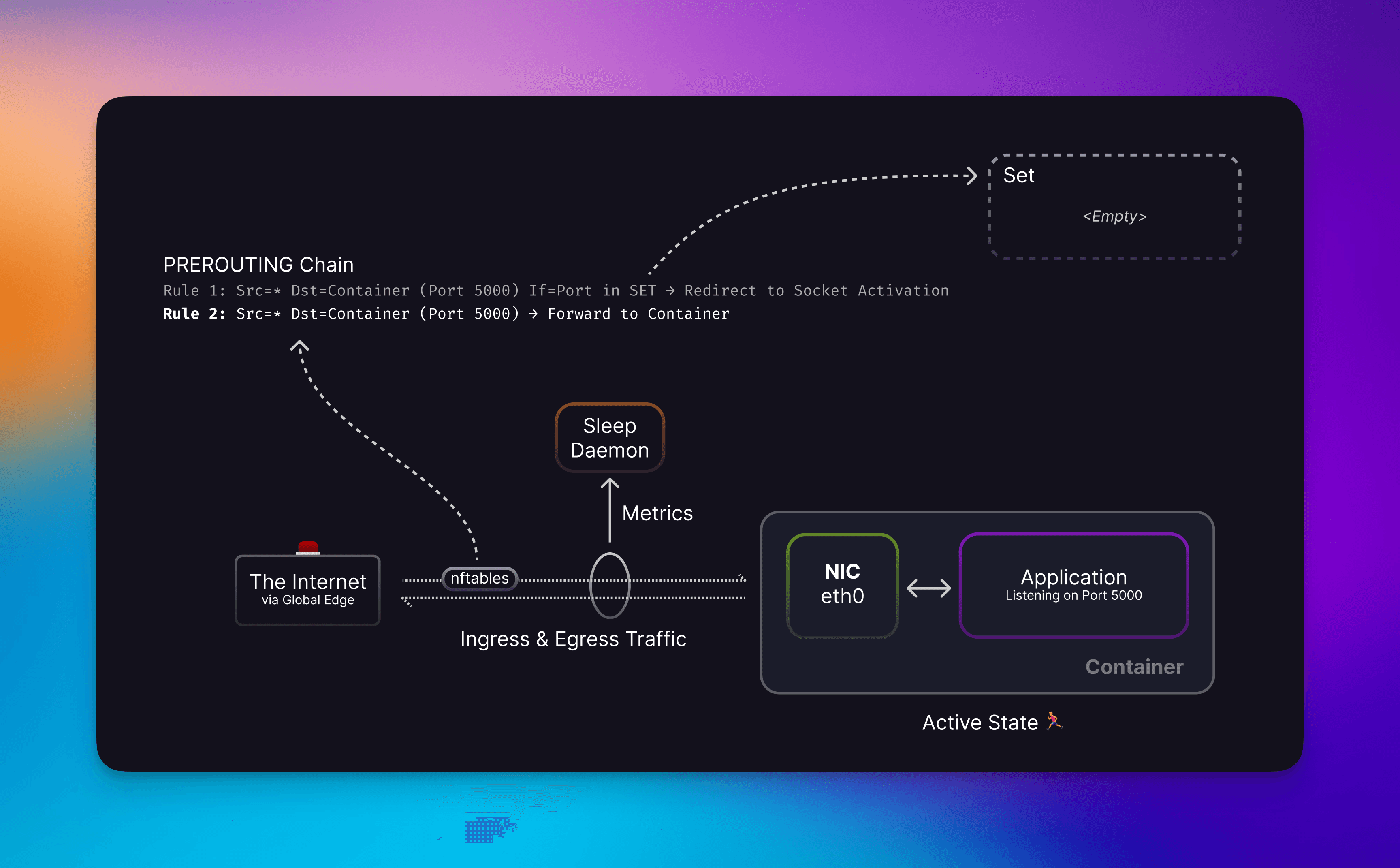 What we’ve built is a L4 socket activation server. When your container is flagged as inactive, we add your container’s port to the redirect set which causes TCP traffic destined for your container’s port to be sent to the socket activation server. When the connection is handled, we’ll read the SO_ORIGINAL_DST socket option set when a connection has been redirected by nftables to get the original port. This allows us to find your stopped container and start it.