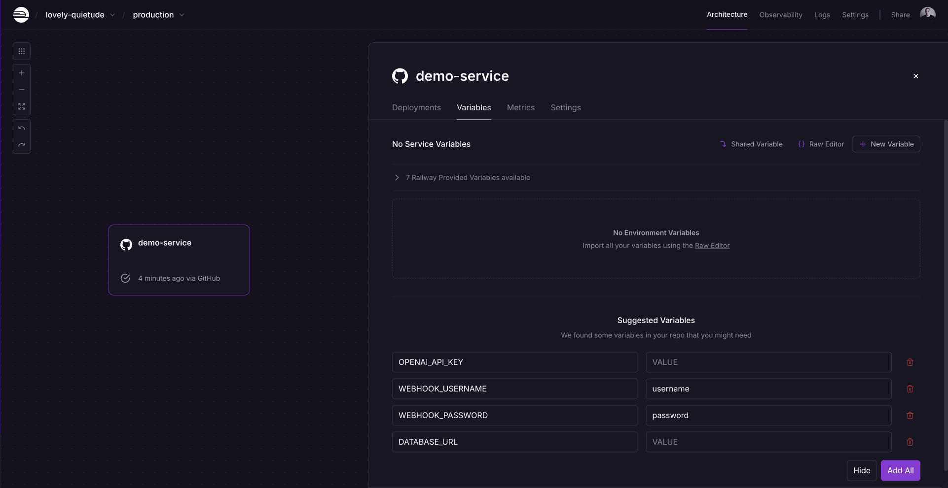 - No shared environment variables: Each deployed app has its own isolated set of variables, making it harder to manage secrets across multiple services